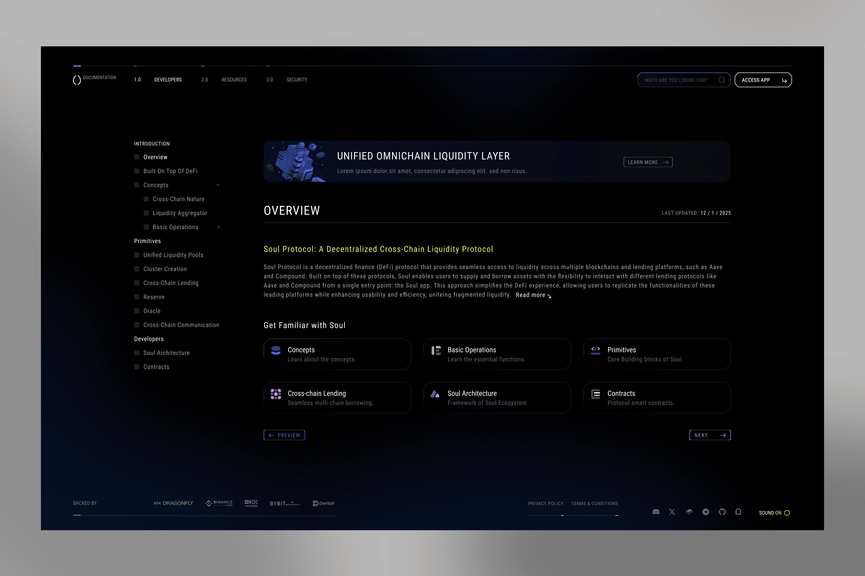 Full redesign of the Soul Labs landing experience and Docs pag, aligning the platform’s interface with its evolving mission, vision, and product direction. The goal was to transform a fragmented and unclear experience into a cohesive, narrative-driven entry point that communicates the value of a complex DeFi ecosystem.